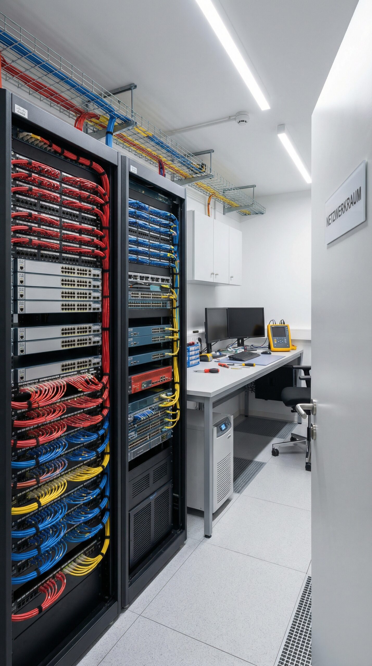 Wir planen und installieren Netzwerkinfrastrukturen nach den aktuellen Normen und Standards. Dazu gehören Cat6a- und Cat7-Verkabelungen für Gigabit-Ethernet sowie die saubere Dokumentation aller Verbindungen.